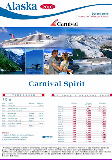 Nota: Precio por persona en dolares americanos en base ocupacion doble y pagaderos tipo cambio del dia de la compra y que indique la naviera. Asistencia en español abordo. Todos los precios, impuestos y propinas están sujetos a cambio sin previo aviso y/o disponibilidad. Carnival se reserva el derecho de modificar o acortar los itinerarios. Asi como de reinstalar el consto de $9.00 usd diarios por concepto de suplemento de combustible: en caso de que el costo del barril exceda los $70.00 usd.Capacidad controlada. Barco registrado en Panama.