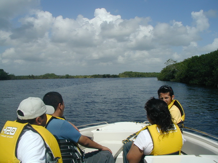 Las orillas del cuerpo de agua son cubiertas por vegetación de selva mediana y baja, que con su verdor suelen rodear algunas pozas de aguas transparentes en las que es posible practicar el buceo como en el Cenote Azul, con 90 metros de profundidad, donde las intrincadas raÃces de los árboles se sumergen en el cenote en laberintos con entradas a cavernas que pueden ser exploradas con la ayuda de expertos y guÃas especializados.