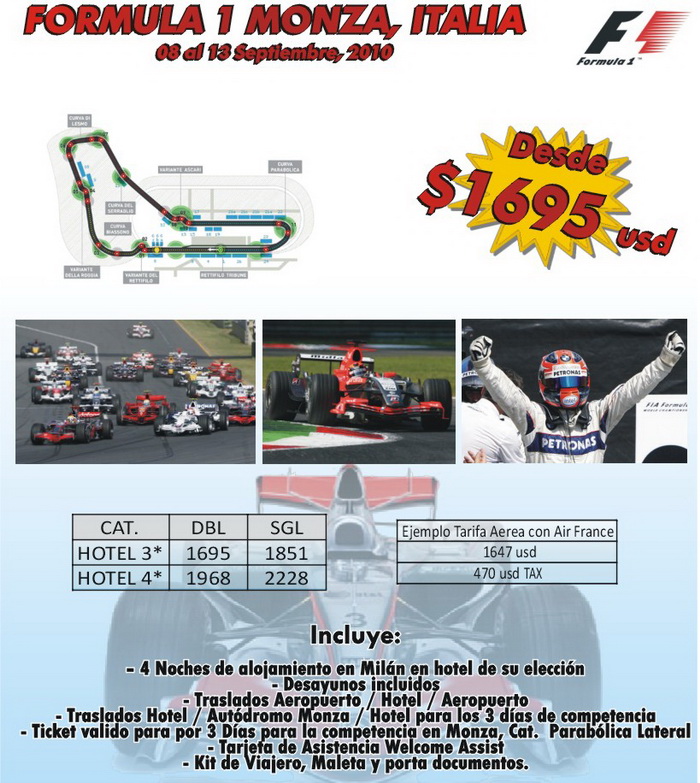 Servicios terrestres desde Milan 4 Noches de alojamiento en Milan traslados al autodromo de Monza Entradas para 3 dias de clasificacion y competencia Categoria Parabolica lateral Viaje a la Formula 1 Pregunte por otros grandes premios en brasil, europa y asia Tambien por carreras de nascar e Indy en estados Unidos Etiquetas: brasil, europa, formula 1